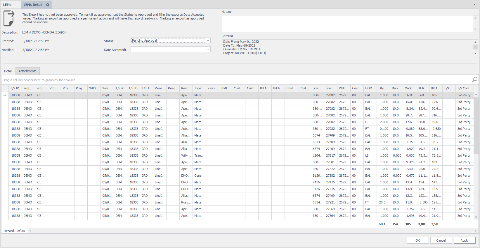 3. If the LEM has not yet been approved, you can review the detailed results and remove any lines that should not be approved. After reviewing results, you can then approve the LEM, which in turn locks the underlying data from future edits.