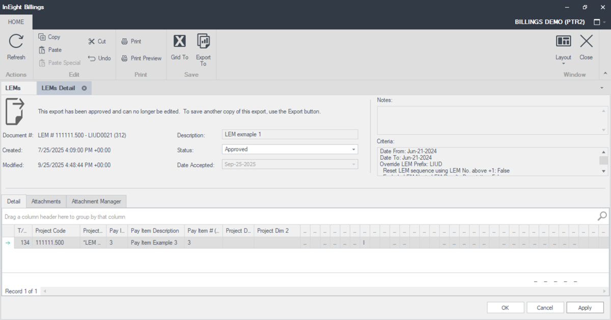 The LEM details page includes the document number, the date it was created, the last modified date, the description, status, and the date accepted. You can also view any notes and criteria linked to the LEM. If there are any related files, you can find the detail attachments in the attachments tab.