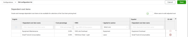The Dependent cost items Configurations section (Project settings > Change > Configurations > Dependent cost items) is used to bring dependent cost item values into cost item pricing.