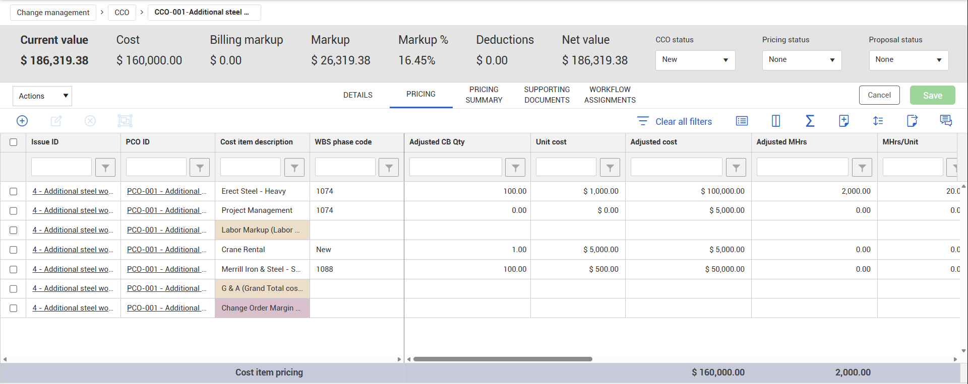 The Pricing tab shows the pricing established at the PCO and issue levels. It includes cost item pricing including any unassigned pricing items and markups. You cannot edit the inherited values on this tab. You can only add an unassigned pricing item, if needed. To make detailed pricing updates, return to the associated issue.