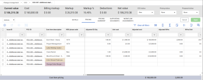 On the CCO Pricing tabs, you can work out the final pricing for your change order, ending up with a current value for the CCO derived from cost items and any assigned markups. You have the same pricing functionality on the CCO Pricing tabs as you have on the PCO Pricing tabs.
