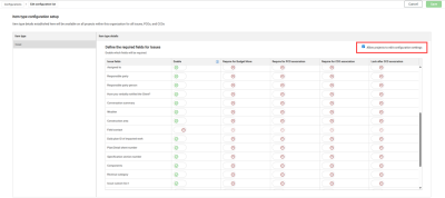 Configure issue fields with item type configuration setup – You can now define the required fields for issues in the new Item type configuration setup page. The settings let you specify whether fields are enabled, and if so, if they are required for budget moves or PCO or CCO association. You can also specify whether to lock the field after CCO association.