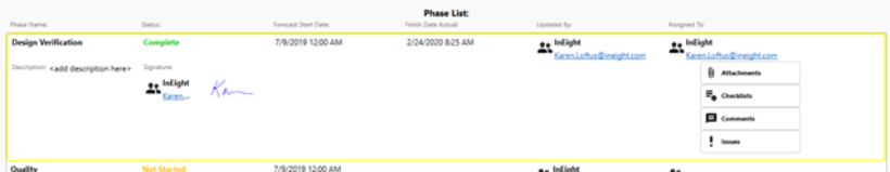 The complete Phase will show the status of Complete, along with a Finish Date Actual, and with the signature of the person.