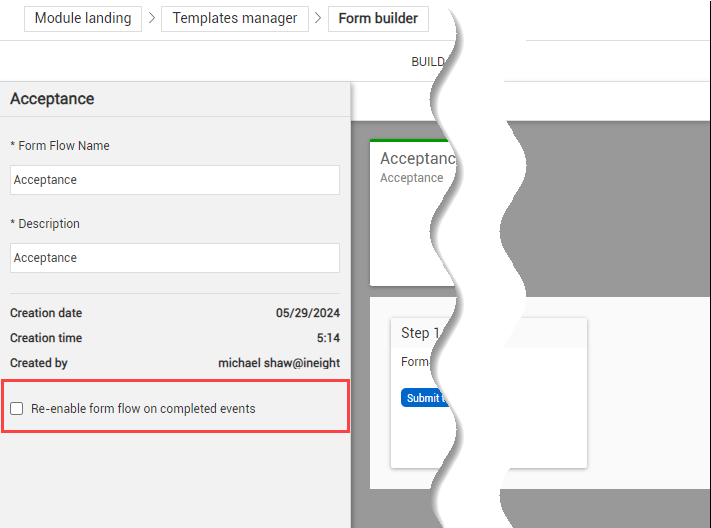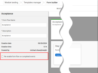 You can let users re-enable the form flow of a completed event by selecting a form flow, and then selecting the Re-enable form flow on completed events check box in the side panel.
