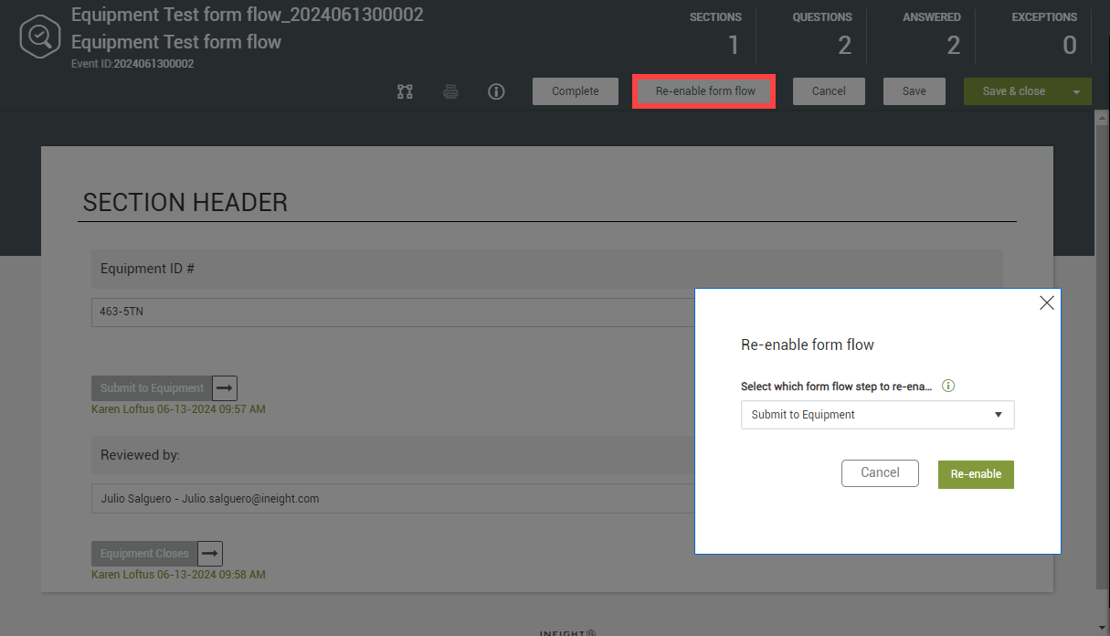 When you re-enable a form flow, you can move it back to the step of their choice. All the completed form flow step data is saved unless you change an answer in a way that leads to different questions based on logic. Only the selected form flow is re-enabled, not all form flows associated with the template. If a re-enabled form flow leads to another form flow that is not re-enabled, the user cannot see the other form flow.