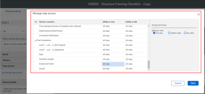 You can set view or edit access by role for each form question or section when the event is in this step. When you select a cell, a panel shows options for all roles, select role, or no roles . Step access does not supersede question access set up in the template. The user permissions set up in InEight Platform supersedes access configured for the step. |
