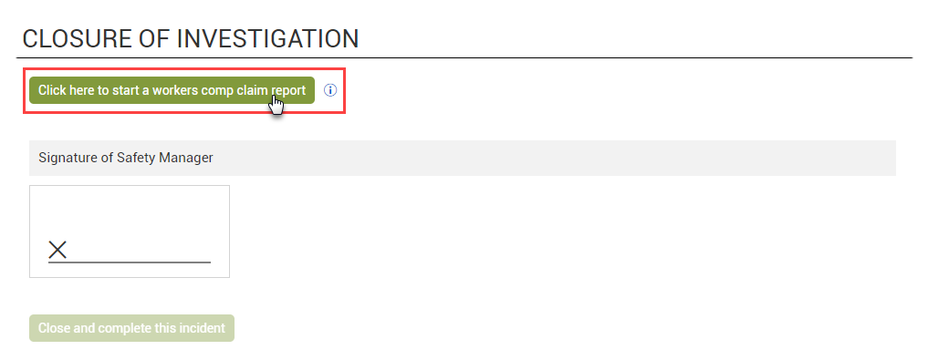 Forms most often have a button at the end to move the form along in its process. In this case, the Click here to start a workers comp claim report button initiates the form within a form feature, where the system branches to another form, in this case the Workers Comp claim form.