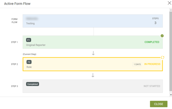 When you open an event from the Events page, and the event has a form flow that has been started, you can click the View active form flow icon at the top of the page. The Active Form Flow dialog box opens.