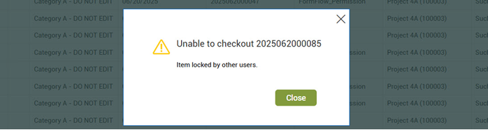 When an Event or Task is checked out, the location column shows who it's checked out to. When attempting to checkout an item that is already checked out by another user, an alert shows stating the item is locked by other users. Locked items remain locked unless you force a check in, complete the form or manually check the item in.