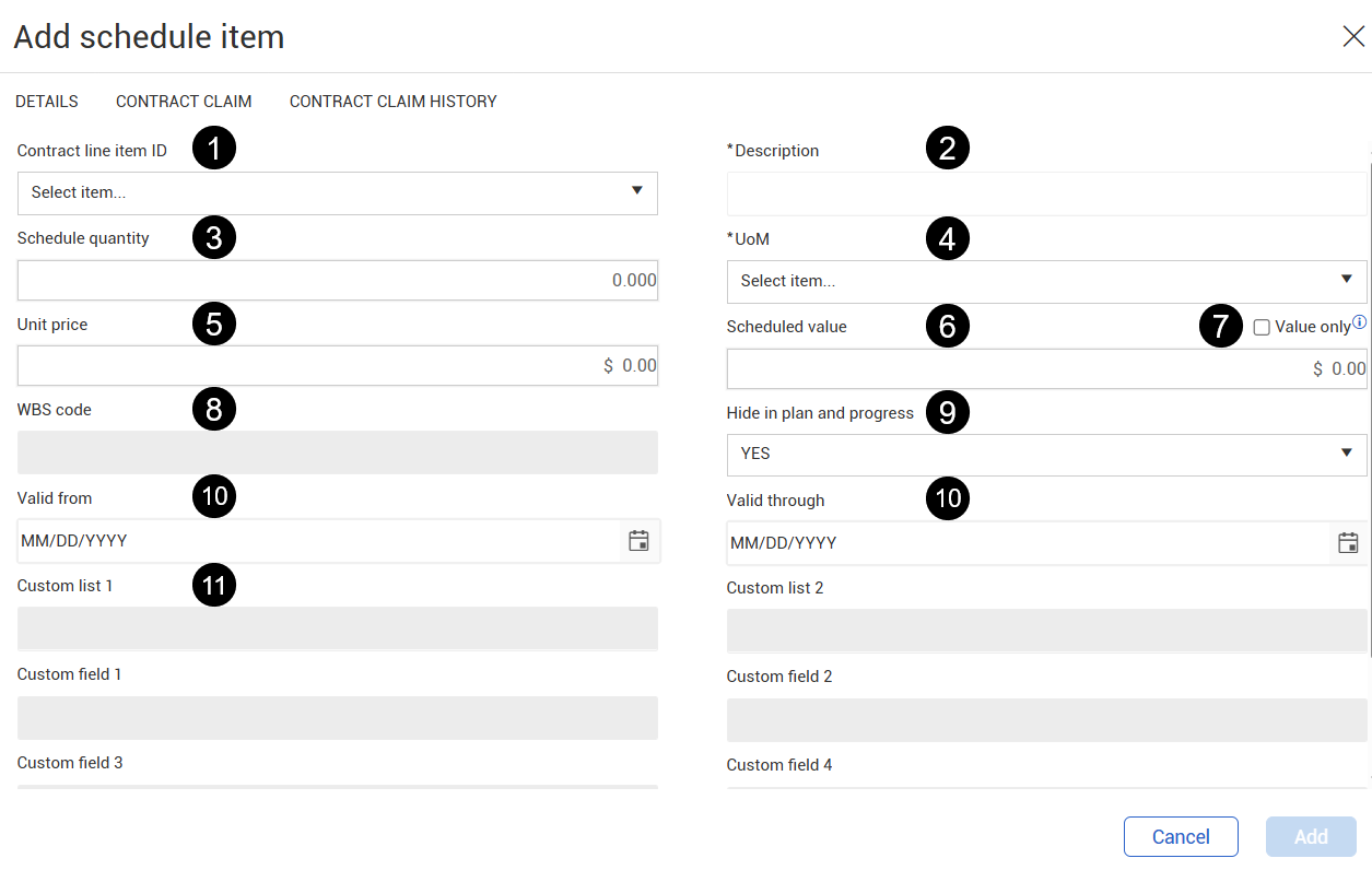 | 7 | Value only | Select the Value only check box to create a value-only schedule item. Checking this box disables the Schedule quantity and Unit price fields. Also, the Hide in plan and progress field is set to Yes and then disabled. |