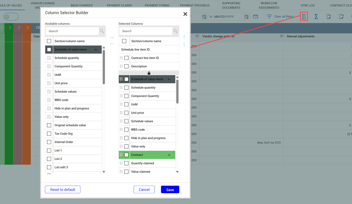 When you open the Schedule of values register, only the Schedule of value items and Summary progress tabs show. You can add other sections and columns as needed. After you have added the sections or columns they remain in the view until they are removed, or you reset the defaults in the Column Selector Builder dialog box.