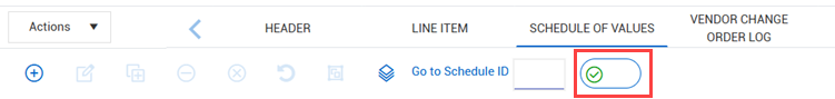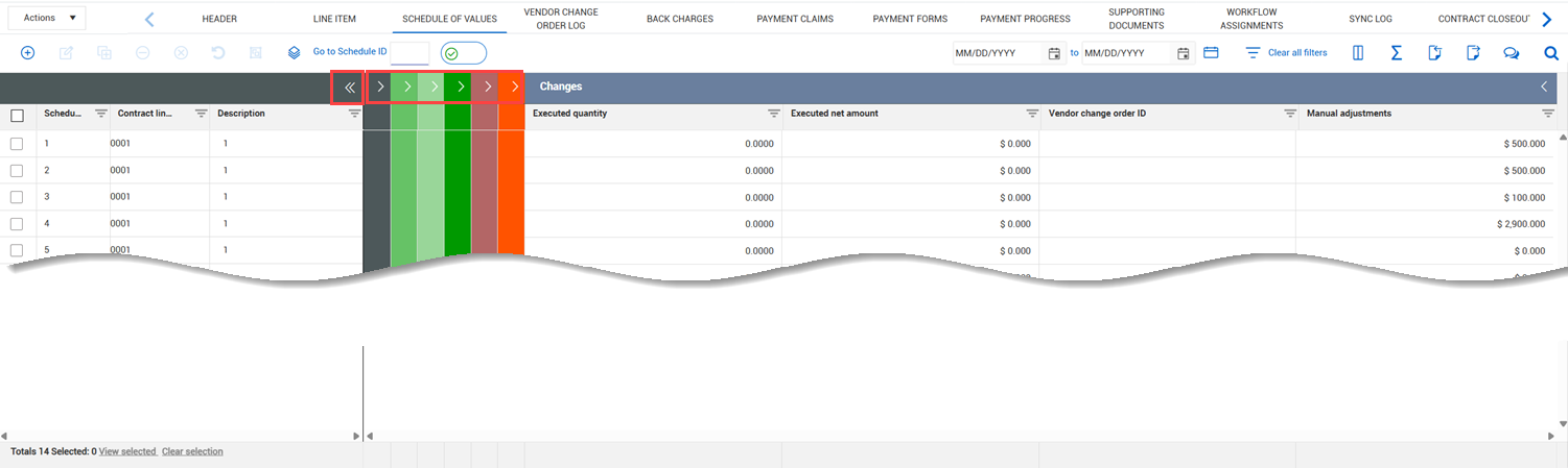 You can choose between the standard grid and the single grid registers. The single grid register features faster loading and scrolling times, and collapsible sections that are color coded to be consistent with the Line items tab. The standard grid presentation, features collapsible sections that are a light gray color. Delays in scrolling and loading might occur. Use the Schedule of values single grid toggle at the top of the page to switch between the presentations. When the toggle is set to On, the enhanced single grid version shows. The toggle defaults to On.