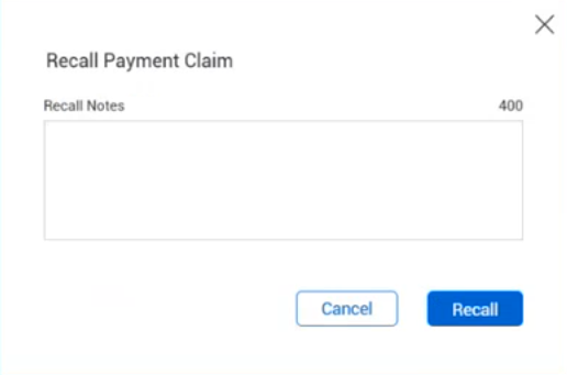 From the payment claims Details page, click the Recall button. The Recall Payment Claim dialog box opens.