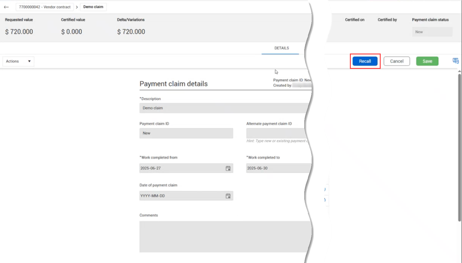 What's next: The payment claim is recalled. The payment claim status is removed from the contractor's Payment claims register. You can make changes to the payment claim and resubmit it.