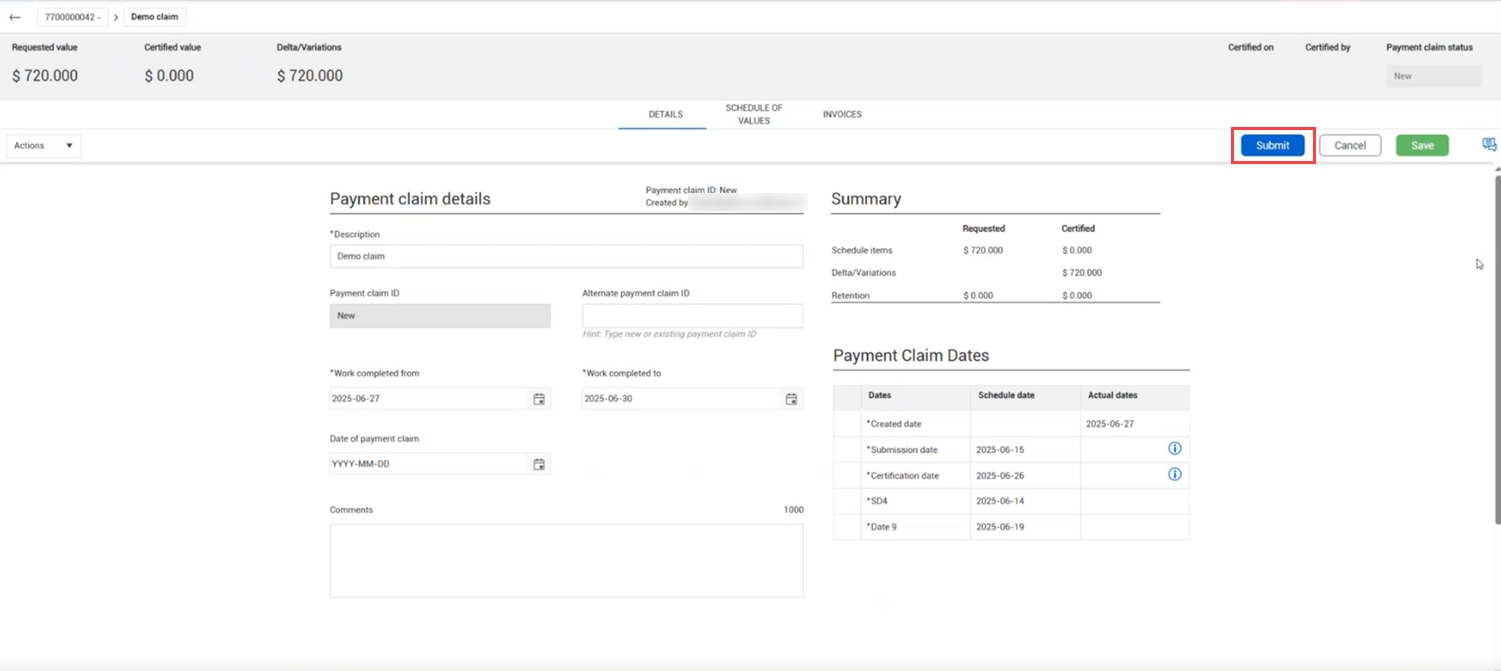 From the payment claim Details page, click the Submit button.