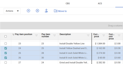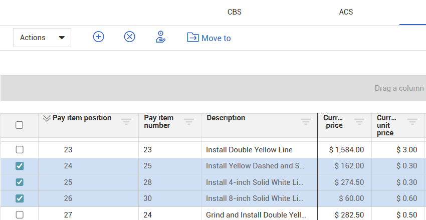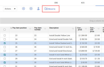 • Move to - Move pay items within the structure using another pay item position, number, or description.