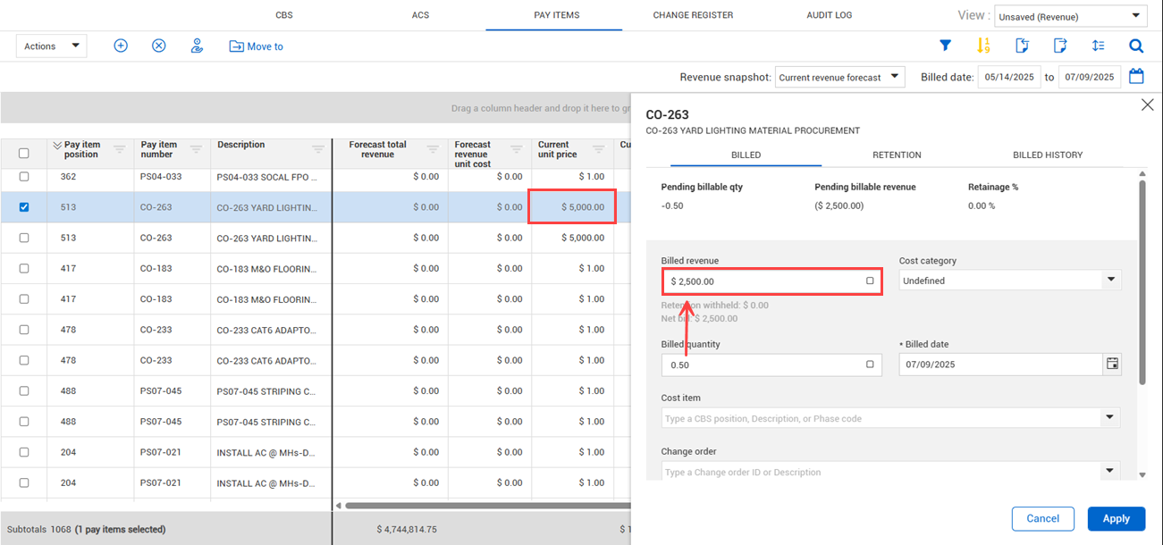 When you bill revenue or quantity for unit price pay items, the billed quantity or revenue automatically adjusts proportionally to the entered billed value to match the unit price.