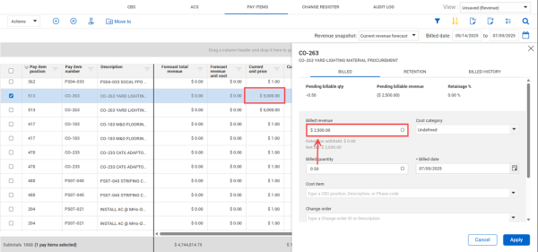 On the Pay Items tab, click the ellipses next to the pay item description, and then select Billed revenue details. The Billed revenue details slide-out opens.