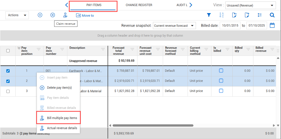 Revenue billing often includes multiple pay items. For that reason, Control also lets you claim billed quantities and revenue for multiple pay items at a time using the Pay Items register. This is in lieu of using the Billed revenue details slide-out panel to bill one item at a time.