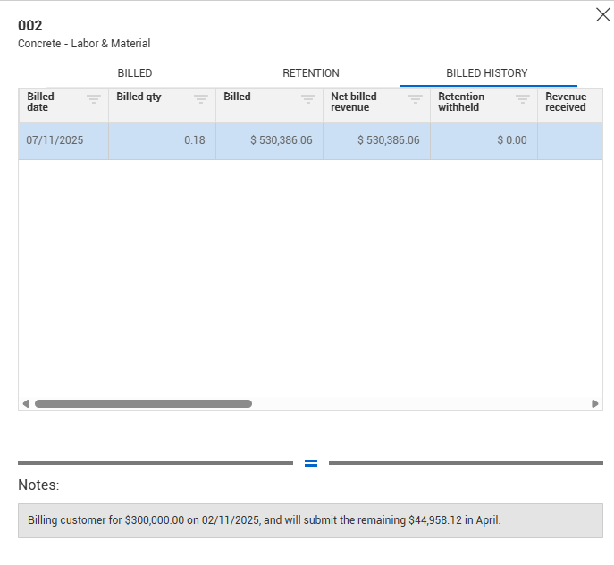 In the Retention tab, you can view any retention amounts from previous transactions, such as retention withheld, released (to date), and amount released, similar to the Retention tab in the Billed revenue details slide-out panel.