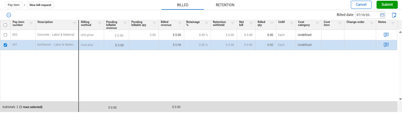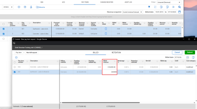 In the New Bill Request, the values in the Billed quantity and Billed revenue fields are the amounts that are to be billed to the customer. The Billed Revenue and Billed Quantity columns show the same amounts that exist in the Pay Item register under the Pending billable quantity and Pending billable revenue columns.