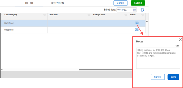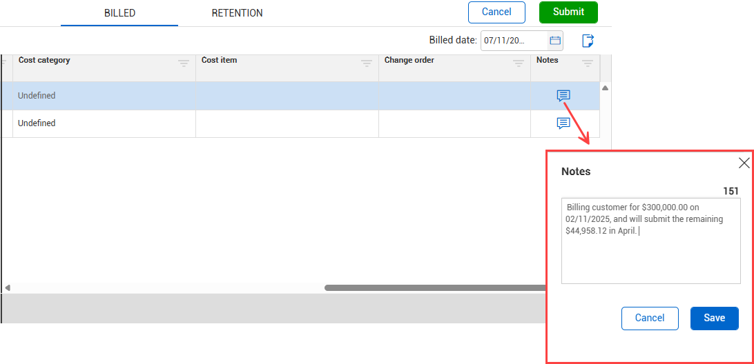 In the Notes column, you can select to enter and save any information specific to the bill request. Click the Notes icon in the Notes column to open the form field.