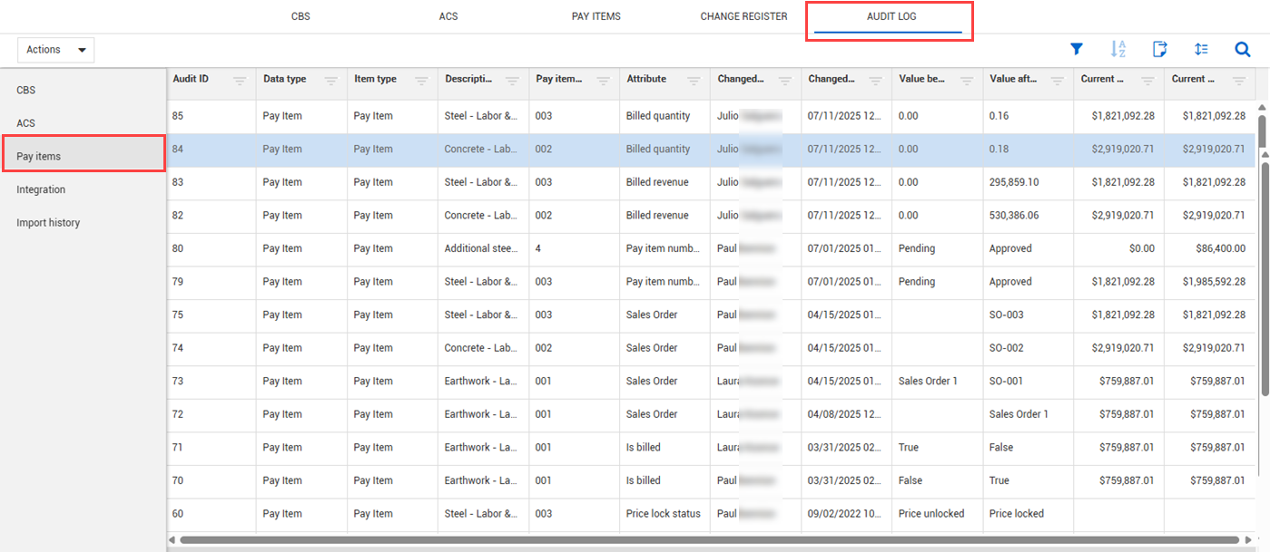Submitting the new bill request also creates new audit log entries in the Pay Item's audit log. The entries include the pay item that was changed, fields that show before and after values, and the user that made the change.
