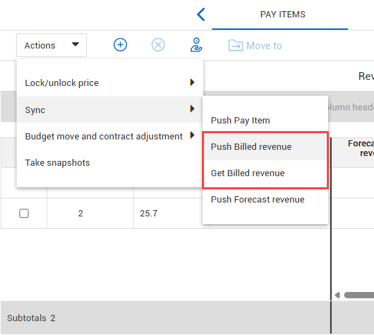 You can sync billed revenue with your integrated billing system. To update a pay item’s billed revenue to your integrated billing system, go to Actions > Sync, and then select Push Billed revenue. To update billed revenue in Control, select the Get Billed revenue option.