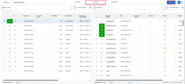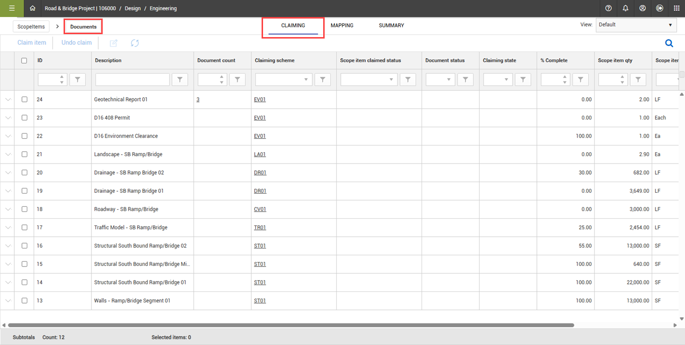 If multiple documents are associated with a scope item, Design looks for the furthest completed document status of all documents when compared to the statuses on the scope item’s claiming scheme.