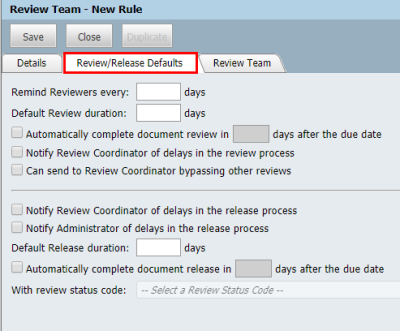 Automatically complete document release in X days after the due date – The system will auto release documents if the Review Coordinator has not released them prior to a defined number of days after the due date. Select the Review Status code to be assigned in the case of Automatic Release.