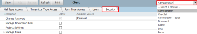 From the bottom part of the screen under Security tab select the relevant area from the drop down on the right to delegate in the areas of Administration, Configuration Tables and Document.![]()