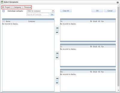 Select whether the mandatory recipients for the mail type are to be applied on a Project, Company, or Personal basis.