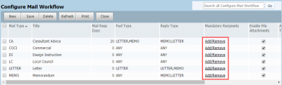 From the Configure Mail Workflow screen, click Add/Remove link under the Mandatory Recipients heading next to the required mail type.