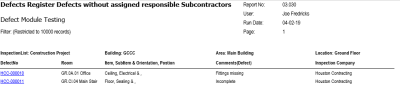 The ‘Defects without assigned responsible Sub Contractors’ report provides a summary of the registered defects that have not been assigned to a Sub Contractor, grouped by the Area.