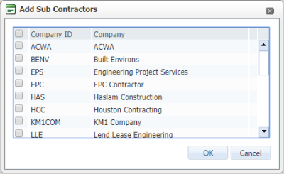 This opens a list of all Sub Contractors on the project. Select each Sub Contractor by checking the box next to the Sub Contractor. Once all relevant Sub Contractors are selected, click OK to add them.