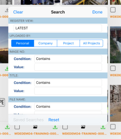 The Advanced search includes options to filter based on the register view, the image details, date range, address, Image tags and the file type. More search options can also be filtered for by clicking on the link above the Manage button.
