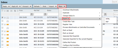 Mail items stored in the InEight Document Inbox, Sent Items, or Drafts mail folders can be exported to HTML or PDF format as a single zip file.