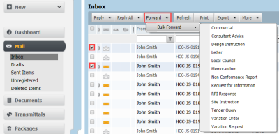From the Inbox or Sent Items Mail Register, click the arrow next to Forward, Bulk Forward and select the mail type to use for forwarding the mail.