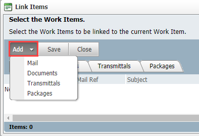 Click Add and select the type of item that you wish to link (eg document, form, package etc) to open the search window.