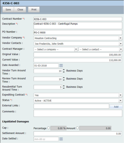 Liquidated Damages Cap: This is defined either in terms of percentage or amount and is only enabled for Expediting Contracts.