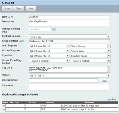 At the bottom of the Item Purchased details window, it is possible to define a schedule for liquidated damages that apply to the late delivery of Deliverable Line Items.