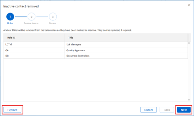 Review any roles from which the contacts will be removed. Replace them as needed by clicking Replace. Click Next.