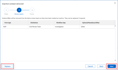 Review any review teams affected and make replacements for the contact by selecting Replace if needed. Click Next.