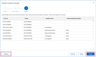 Review any forms that the contacts will be removed from and replace them by clicking Replace, if needed. Click Finish to complete the process.