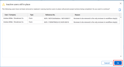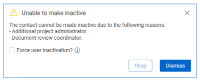 If a contact cannot be set to inactive because they are a project administrator or a document review coordinator, you can force inactivation. The contact remains in place on key processes until they have been replaced or removed, which is necessary to complete the process.