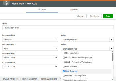 There are two ways to create placeholders in a project. The first is by defining project-specific rules for the placeholder. After the rules are defined, any document uploaded without a view file that meets the criteria is automatically added to the Placeholder register.