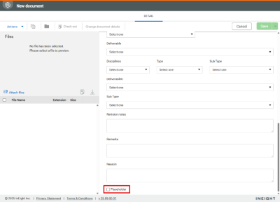 If no rules are defined for the project and a view file is not attached, you can manually mark a document as a placeholder during upload by selecting the option on the Details page.