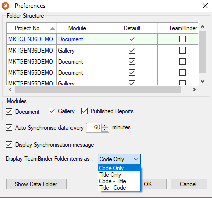 Default: mimics the display folder structure on the project. TeamBinder: display metadata the same as Documents register. |