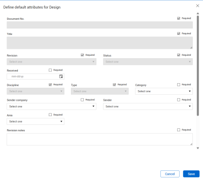 Default attributes can predefine the data for any documents uploaded for the deliverable by the issued company. You can set the default attributes for each submittal type, so you do not have to define them at the deliverable level.