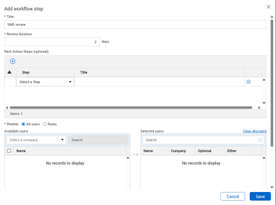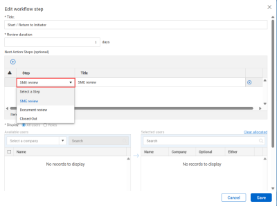 In the Next action steps section, click the Add icon, and then select the step you want to follow the current step. In this example, the SME review step has been selected.